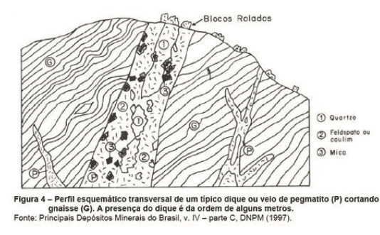 - Pegmatitos moscovíticos: encaixados em mica xistos, originados por anatexia ou fraturamento restrito de granitos, podem conter berilo, columbita, ETRs, U e Th.